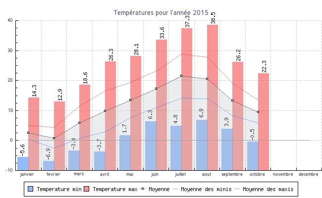 | octobre | -1.7 °C | 4.9 °C | 22.3 °C | 13.8 °C | 9.0 °C | 2.1 km/h | 38.6 km/h | NO |