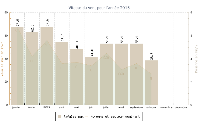 | novembre | 0.7 °C | 6.7 °C | 20.9 °C | 14.4 °C | 10.4 °C | 6.2 km/h | 54.7 km/h | OSO |